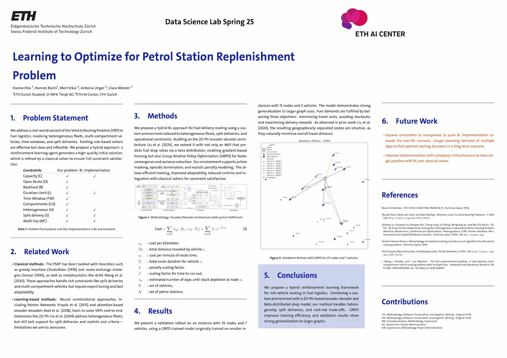 This work, implemented by ETH students Hanno Hiss and Hannes Büchi and supervised by Arqh, proposes a hybrid reinforcement learning framework to solve complex, real-world Vehicle Routing Problems.